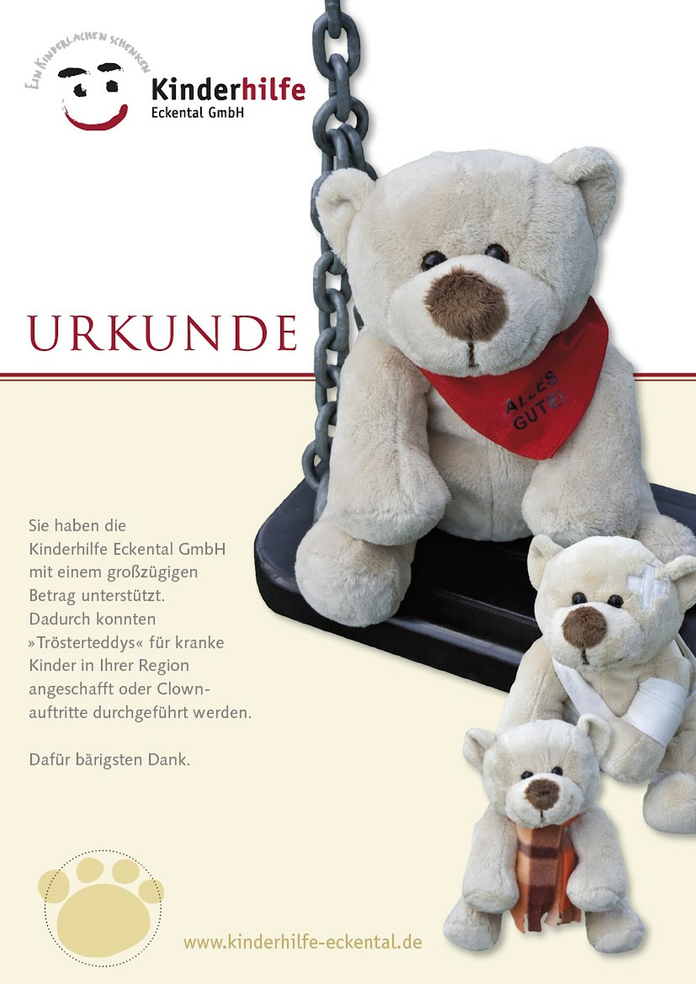 Das mittelständige Unternehmen unterstützt damit die Kinderhilfe Eckenthal, die Kinderkliniken und Kinderstationen sowie Rettungsfahrzeuge und Ambulanzen durch den Erlös mit Trösterteddys ausstattet.